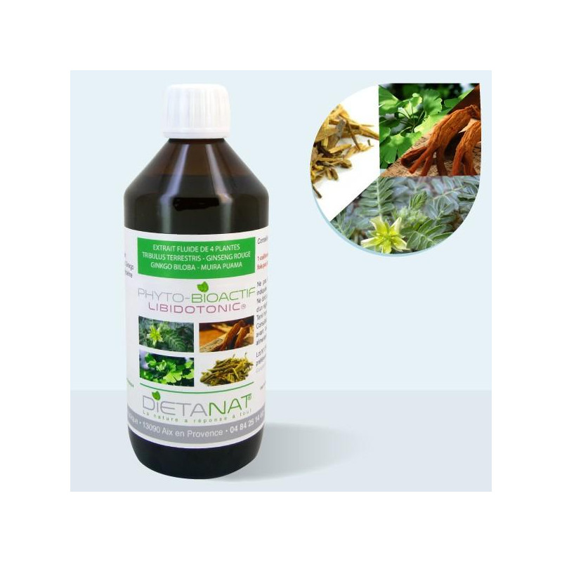 Ginkgo: 135,45 mg, Gingembre: 135,45 mg, Tribulus terrestris: 45,15 mg, Muira puama 90,30mg, Ginseng rouge: 22,65mg, Bougeons de Chêne: 7,5mg.
