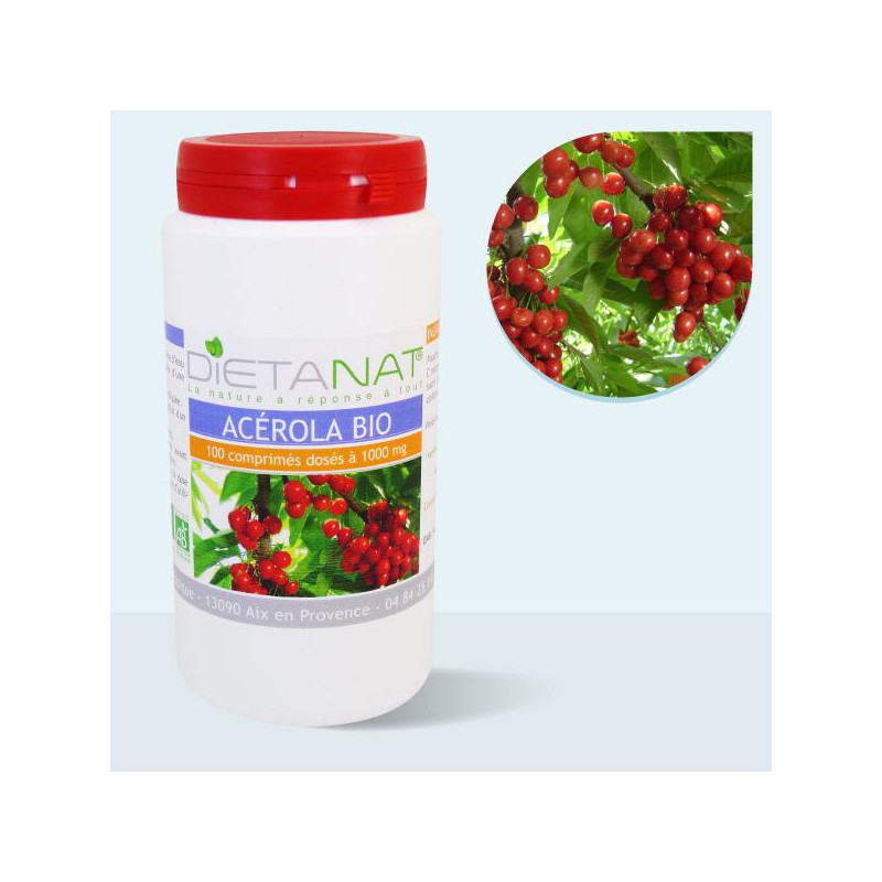 Poudre d'extrait d'Acérola* 1000mg (Vitamine C naturelle 175mg correspondant à 292% des apports journaliers recommandés), sucre de canne*, arôme orange*, Carbonate de Magnésium, talc.