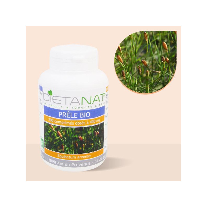 Poudre de Prêle parties aériennes* : 1200 mg, carbonate de magnésium, talc.